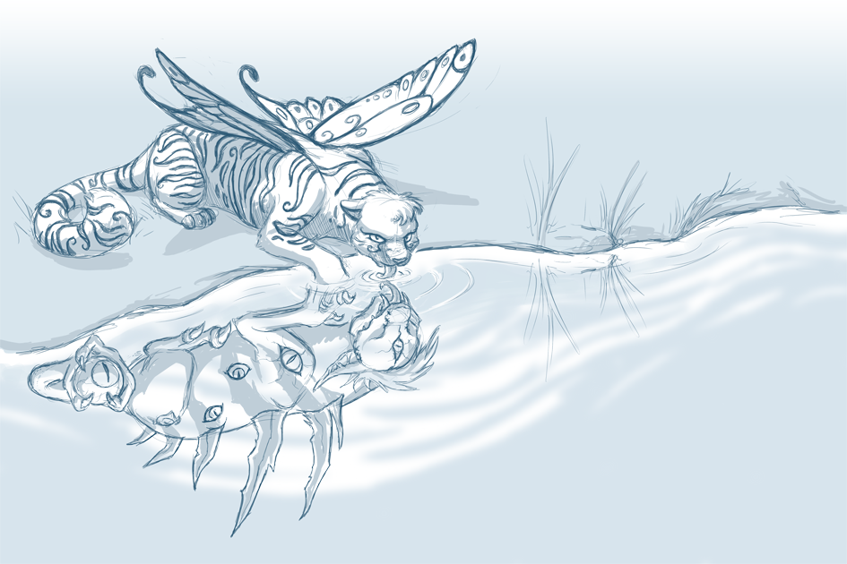 “Please stand down, dear Asher.” A calm voice cut in, the sprite deflating a little as he was forced to release the rest of his words as empty air. He turned as if to scold the person that interrupted him, looking as if he’d just had his feathers ruffled, before seeing the royal twins enter on the back of their great daydream belragoth. The imp king followed shortly after on a twisted, nightmare version of the same species with a few of his servants jogging up, winded, behind him. Princess Aislin waved a hand to the heroic sprite with a calm smile, the sprite lifting his brows high and waving frantically to the group to stand down. The sprites all hurriedly took a knee, Asher no exception as he did the same thing while hovering in the air.